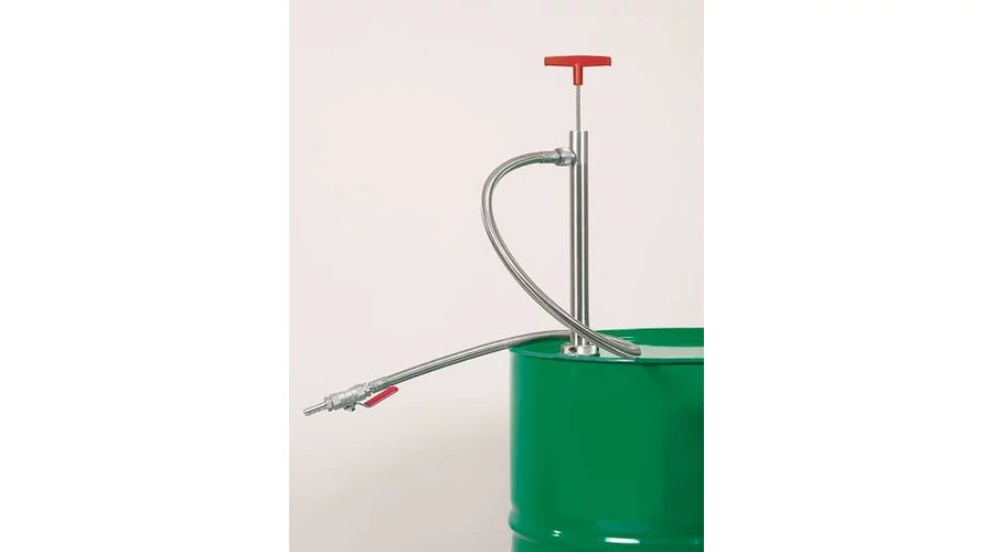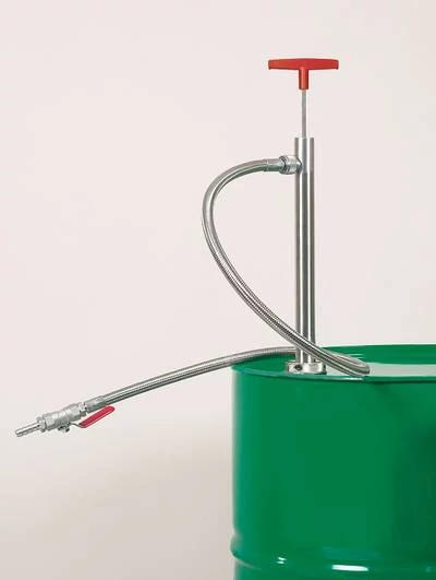 Barrel pump stainless steel with discharge hose and stopcock made of stainless steel and PTFE, can conduct electricity.